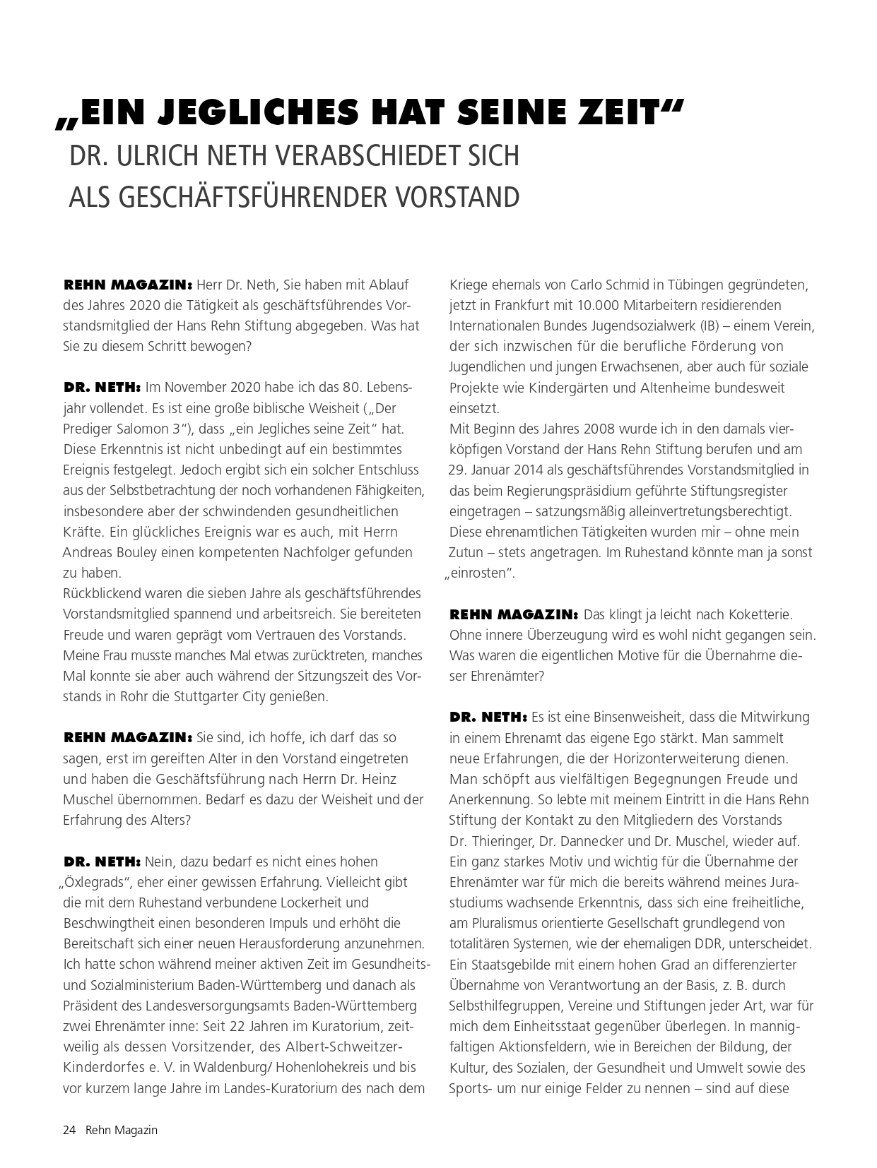 REHN MAGAZIN: Herr Dr. Neth, Sie haben mit Ablauf des Jahres 2020 die Tätigkeit als geschäftsführendes Vorstandsmitglied der Hans Rehn Stiftung abgegeben. Was hat Sie zu diesem Schritt bewogen?